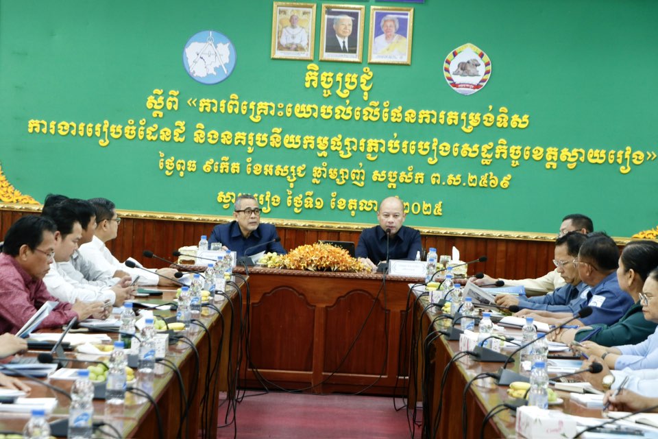 ឯកឧត្តម ប៉េង ពោធិ៍សា អភិបាលនៃគណៈអភិបាលខេត្តស្វាយរៀង និងឯកឧត្តម ឌុច វនទីតូ អនុរដ្ឋលេខាធិការក្រសួងរៀបចំដែនដី នគរូបនីយកម្ម និងសំណង់ បានអញ្ជេីញជាអធិបតីក្នុងក្នុងកិច្ចប្រជុំស្តីពី “ការពិគ្រោះយោបល់លើផែនការតម្រង់ទិសការងាររៀបចំដែនដី និងនគរូបនីយកម្មផ្សារភ្ជាប់របៀងសេដ្ឋកិច្ចខេត្តស្វាយរៀងស្ថិតនៅសាលប្រជុំសាលាខេត្ត ។