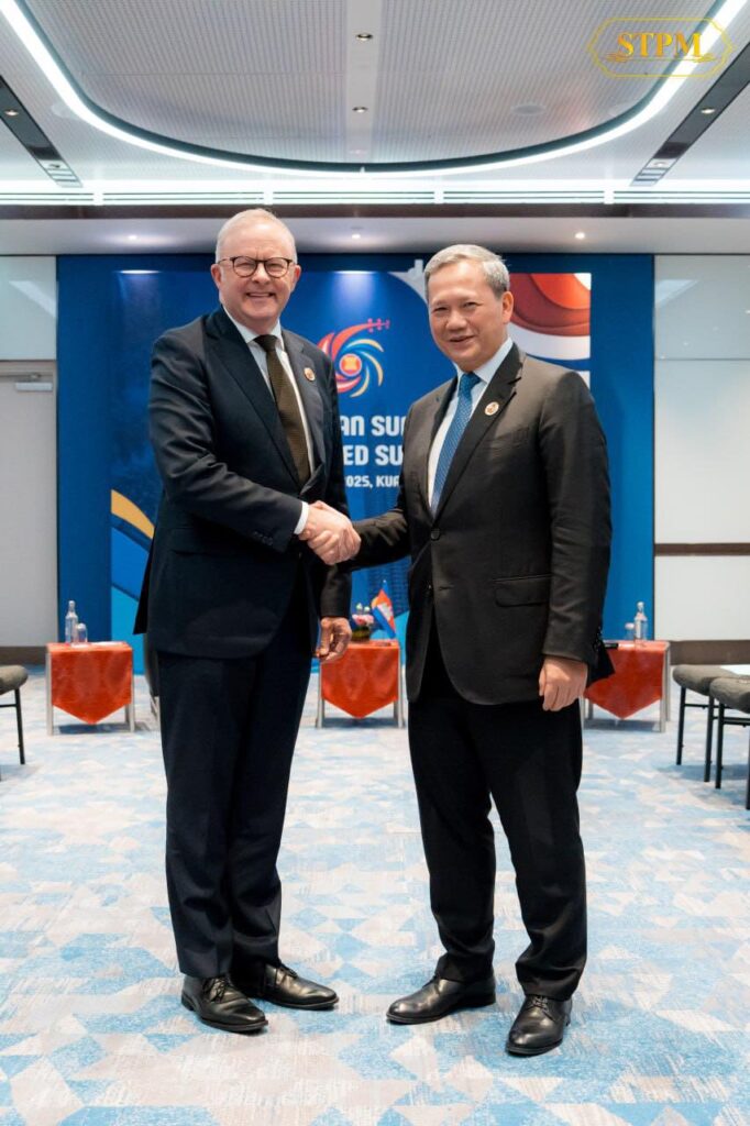 សម្តេចធិបតី ហ៊ុន ម៉ាណែត នាយករដ្ឋមន្រ្តី នៃកម្ពុជា និងឯកឧត្តម Anthony Albanese នាយករដ្ឋមន្ត្រីអូស្ត្រាលី កាលពីថ្ងៃទី ២៧ ខែតុលា ឆ្នាំ ២០២៥ បានជួបពិភាក្សាការងារទ្វេភាគី ក្នុងឱកាសចូលរួមកិច្ចប្រជុំកំពូលអាស៊ាន លើកទី ៤៧ និងកិច្ចប្រជុំកំពូលពាក់ព័ន្ធ នៅទីក្រុងគូឡាឡាំពួ ប្រទេសម៉ាឡេស៊ី នៅថ្ងៃទី ២៦-២៨ ខែតុលា ឆ្នាំ ២០២៥។