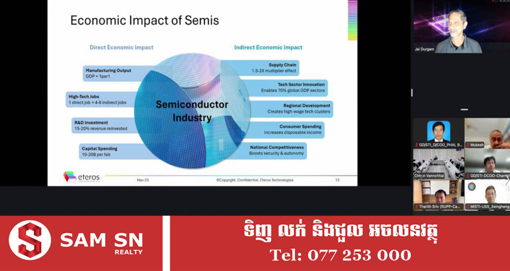 ក្នុងកិច្ចប្រជុំនេះ អ្នកជំនាញមកពីក្រុមហ៊ុន Eteros Technology (USA) និង WBA Japan បានបង្ហាញអំពីនិន្នាការវិស័យសេមីកុងដាក់ទ័រសកល សារៈសំខាន់ជាយុទ្ធសាស្រ្តនៃការចាប់យកប្រព័ន្ធស្វ័យប្រវត្តិកម្មសម្រាប់ការរចនាអេឡិចត្រូនិក (Electronic Design Automation) និងកម្មវិធីបណ្តុះបណ្តាលជំនាញឯកទេសសម្រាប់កម្ពុជាលើជំនាញរចនា និងការអនុវត្តសំខាន់ៗ។