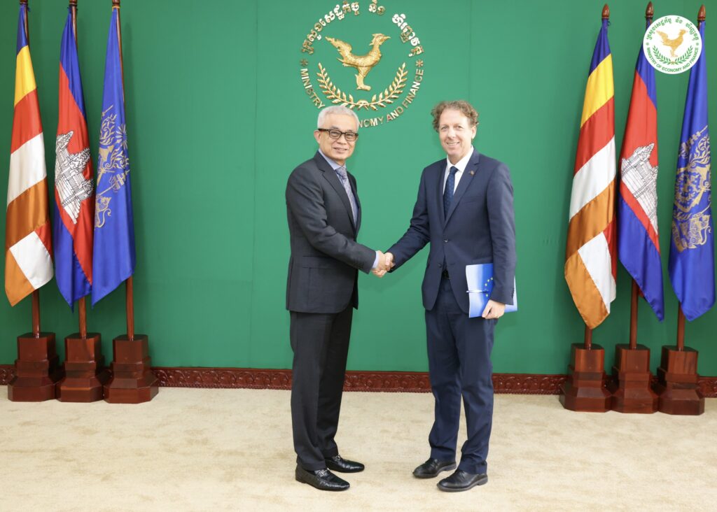 កាលពីថ្ងៃទី១៩ ខែធ្នូ ឆ្នាំ២០២៥, នៅទីស្ដីការក្រសួងសេដ្ឋកិច្ច និងហិរញ្ញវត្ថុ, ឯកឧត្តមអគ្គបណ្ឌិតសភាចារ្យ អូន ព័ន្ធមុនីរ័ត្ន ឧបនាយករដ្ឋមន្រ្តី រដ្ឋមន្រ្តីក្រសួងសេដ្ឋកិច្ច និងហិរញ្ញវត្ថុ និងឯកឧត្តម អ៊ីហ្គូ ទ្រីសម៉ាន់ ឯកអគ្គរដ្ឋទូតសហភាពអឺរ៉ុបប្រចាំកម្ពុជា បានជួបសន្ទនាទ្វេភាគី ដើម្បីបញ្ជាក់សារជាថ្មីនូវភាពជាដៃគូសហប្រតិបត្តិការដ៏រឹងមាំ ក៏ដូចជា ដើម្បីពិនិត្យមើលនូវវឌ្ឍនភាពក្នុងវិស័យសំខាន់ៗនៃកិច្ចសហប្រតិបត្តិការកន្លង។