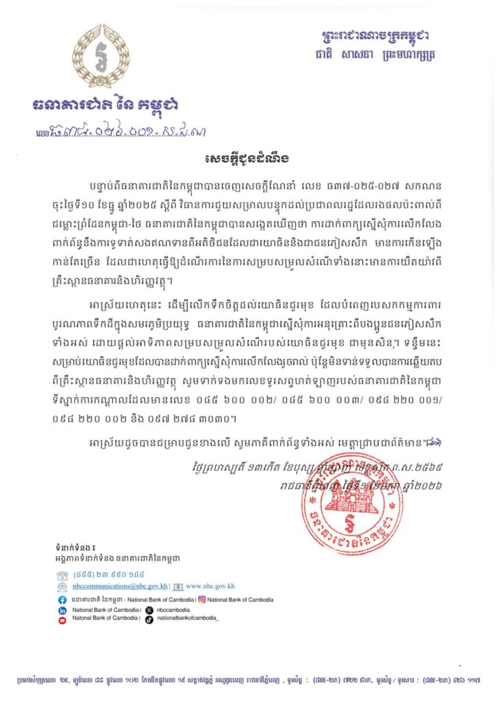 បន្ទាប់ពីធនាគារជាតិនៃកម្ពុជាបានចេញសេចក្តីណែនាំ លេខ ធ៣៧-០២៥-០២៧ សកណន ចុះថ្ងៃទី១០ ខែធ្នូ ឆ្នាំ២០២៥ ស្តីពី វិធានការជួយសម្រាលបន្ទុកដល់ប្រជាពលរដ្ឋដែលរងផលប៉ះពាល់ពី ជម្លោះព្រំដែនកម្ពុជា-ថៃ ធនាគារជាតិនៃកម្ពុជាបានសង្កេតឃើញថា ការដាក់ពាក្យស្នើសុំការលើកលែង ពាក់ព័ន្ធនឹងការទូទាត់សងឥណទានពីអតិថិជនដែលជាយោធិននិងជាជនភៀសសឹក មានការកើនឡើងកាន់តែច្រើន ដែលជាហេតុធ្វើឱ្យដំណើរការនៃការសម្របសម្រួលសំណើទាំងនោះមានការយឺតយ៉ាវពី គ្រឹះស្ថានធនាគារនិងហិរញ្ញវត្ថុ។