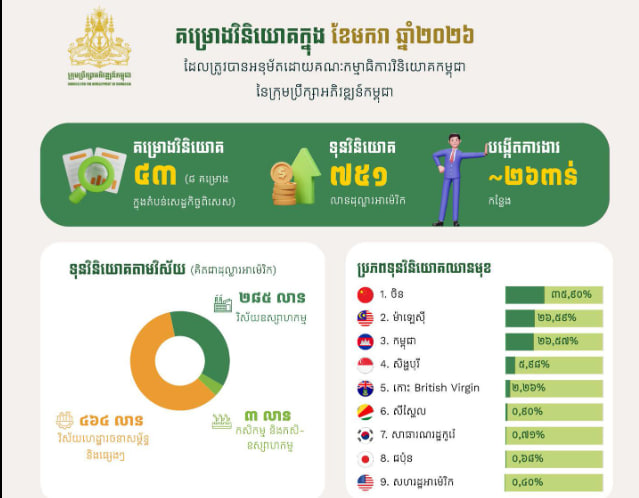ក្នុងខែមករា ឆ្នាំ២០២៦ គណៈកម្មាធិការវិនិយោគកម្ពុជានៃក្រុមប្រឹក្សាអភិវឌ្ឍន៍កម្ពុជាបានសម្រេច ចុះបញ្ជីគម្រោងវិនិយោគសរុបចំនួន ៤៣ គម្រោង ក្នុងទំហំទុនវិនិយោគសរុបប្រមាណ ៧៥២ លានដុល្លារអាម៉េរិក និងអាចបង្កើតការងារបានប្រមាណ ២៦ ពាន់កន្លែង។ នេះបើយោងតាមរបាយការណ៍របស់ក្រុមប្រឹក្សាអភិវឌ្ឍន៍កម្ពុជា ដែលចេញផ្សាយនៅថ្ងៃទី១០ ខែកុម្ភៈ ឆ្នាំ២០២៦។