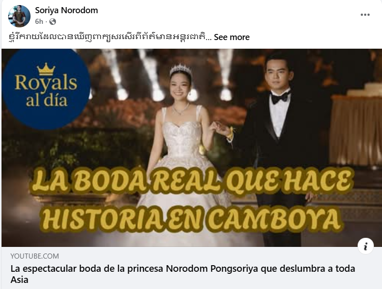 ក្រៅពី ទស្សនាវដ្ដី Point de vue បារាំង ក៏មានឆាណែល YouTube អេស្ប៉ាញ Royals al Dí បានផ្សាយពីមង្គលការកូនប្រុសអ្នកឧកញ៉ា អ៊ឹង ប៊ុនហ៊ូវ សហស្ថាបនិកក្រុមហ៊ុន អាយអិនជី ហូលឌីង គឺលោក អ៊ឹង ស៊ីវឈន់ ដែលជាសហគ្រិនវ័យក្មេងកាន់ក្រុមហ៊ុនច្រើន និងព្រះនាង សូរិយា ក្មួយស្រីមហាក្សត្រខ្មែរនាពេលបច្ចុប្បន្ន ដែលបានរៀបមង្គលការធំអស្ចារ្យ កាលពីពេលថ្មីៗនេះ។