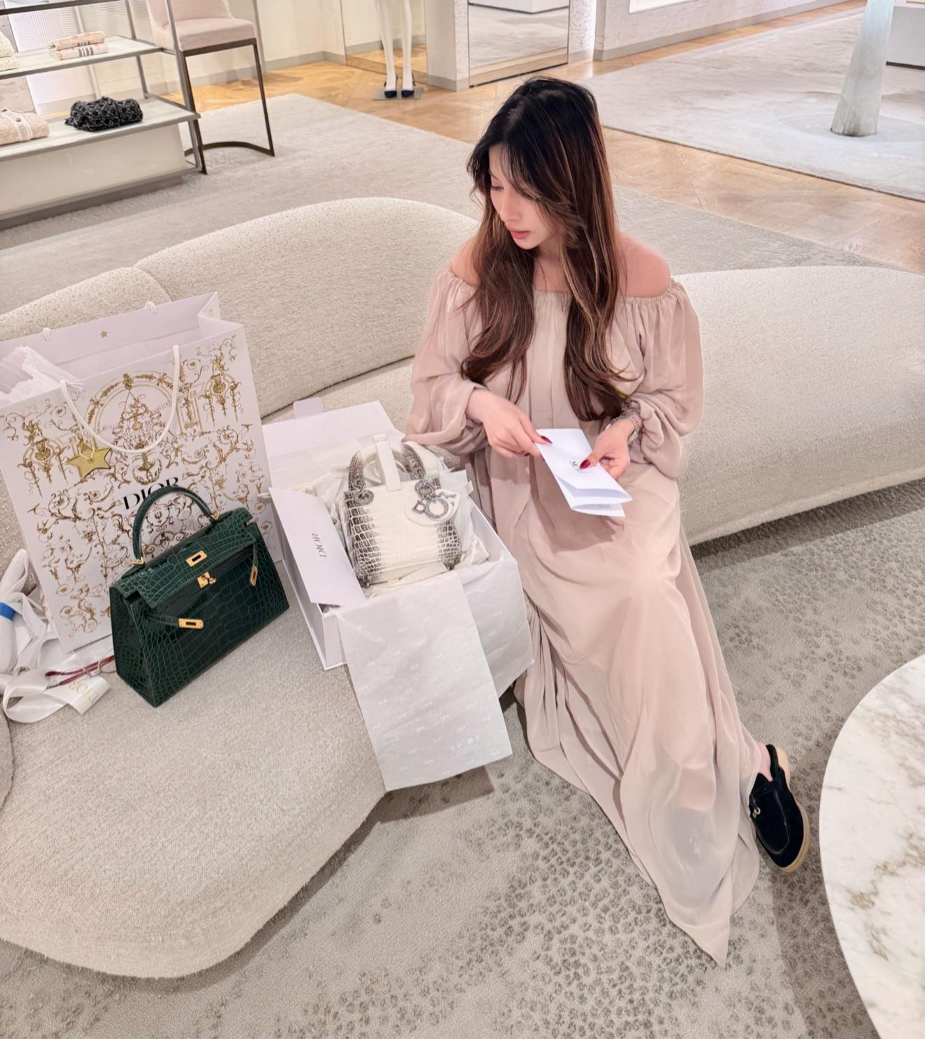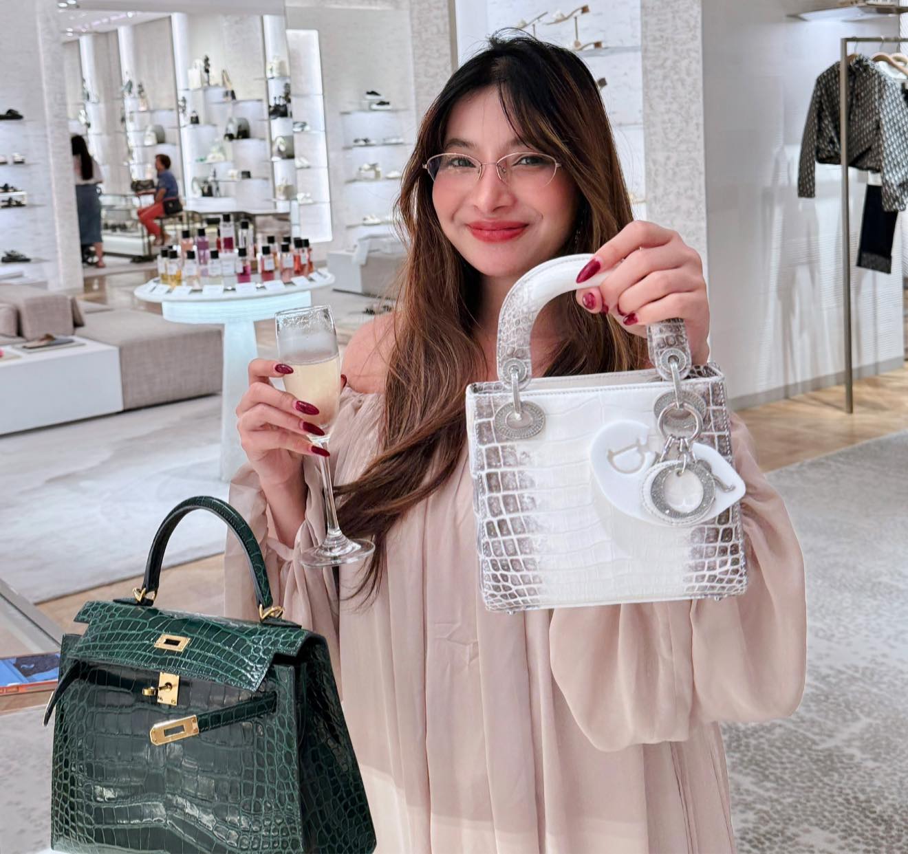 សេដ្ឋិនីអនឡាញ ស្រីណៃ បានបញ្ជាក់ពីតម្លៃកាបូប កាបូបដៃតូច Christian Dior Lady Dior ធ្វើពីស្បែកក្រពើ Niloticus ពណ៌ស ជាមួយនឹងបន្តោងកាបូបមានដាំគ្រីស្តាល់រាប់រយគ្រាប់ មានតម្លៃ ៣ ៨០០០ ដុល្លារ។