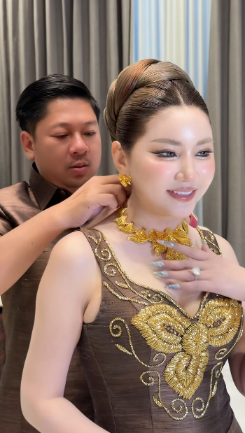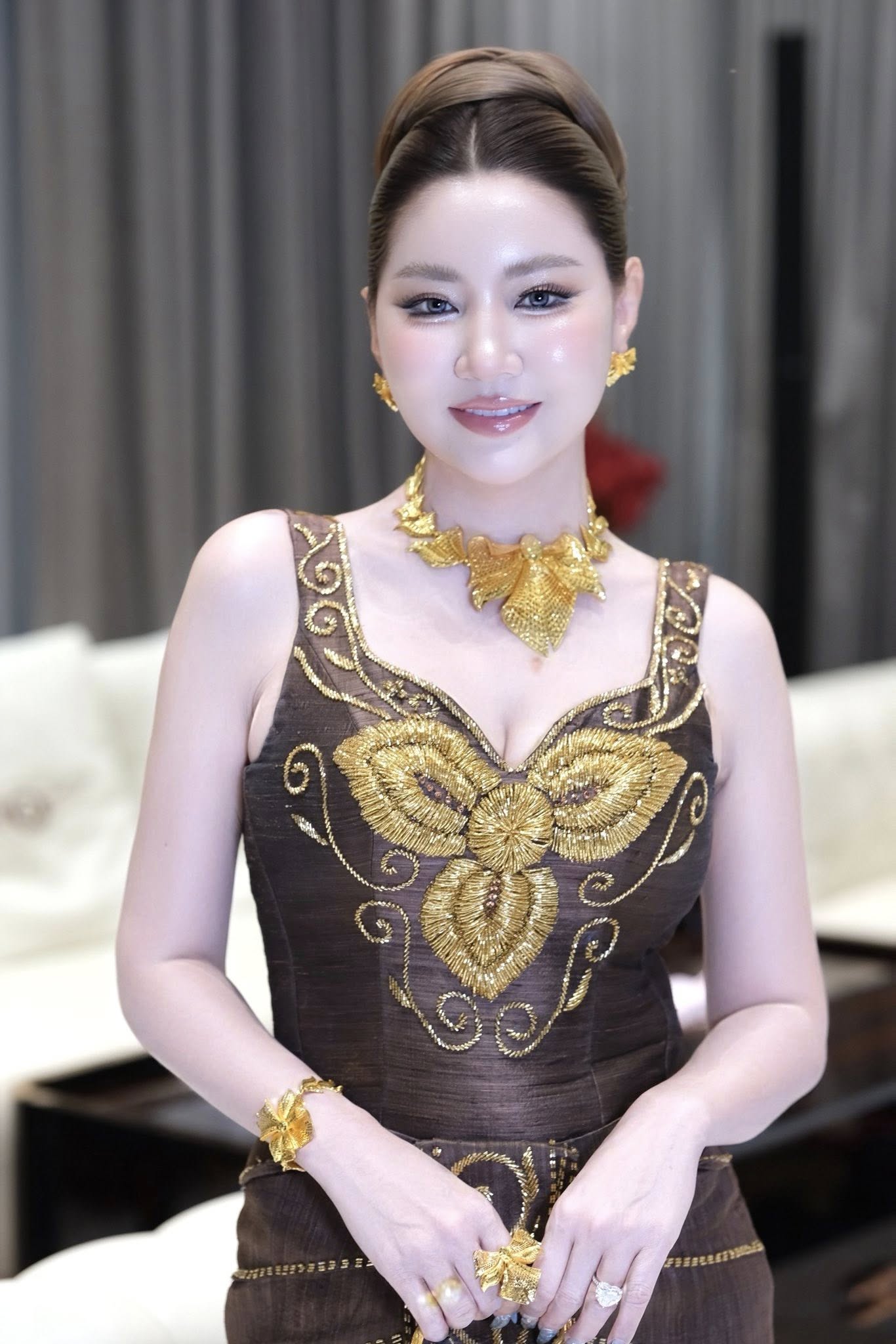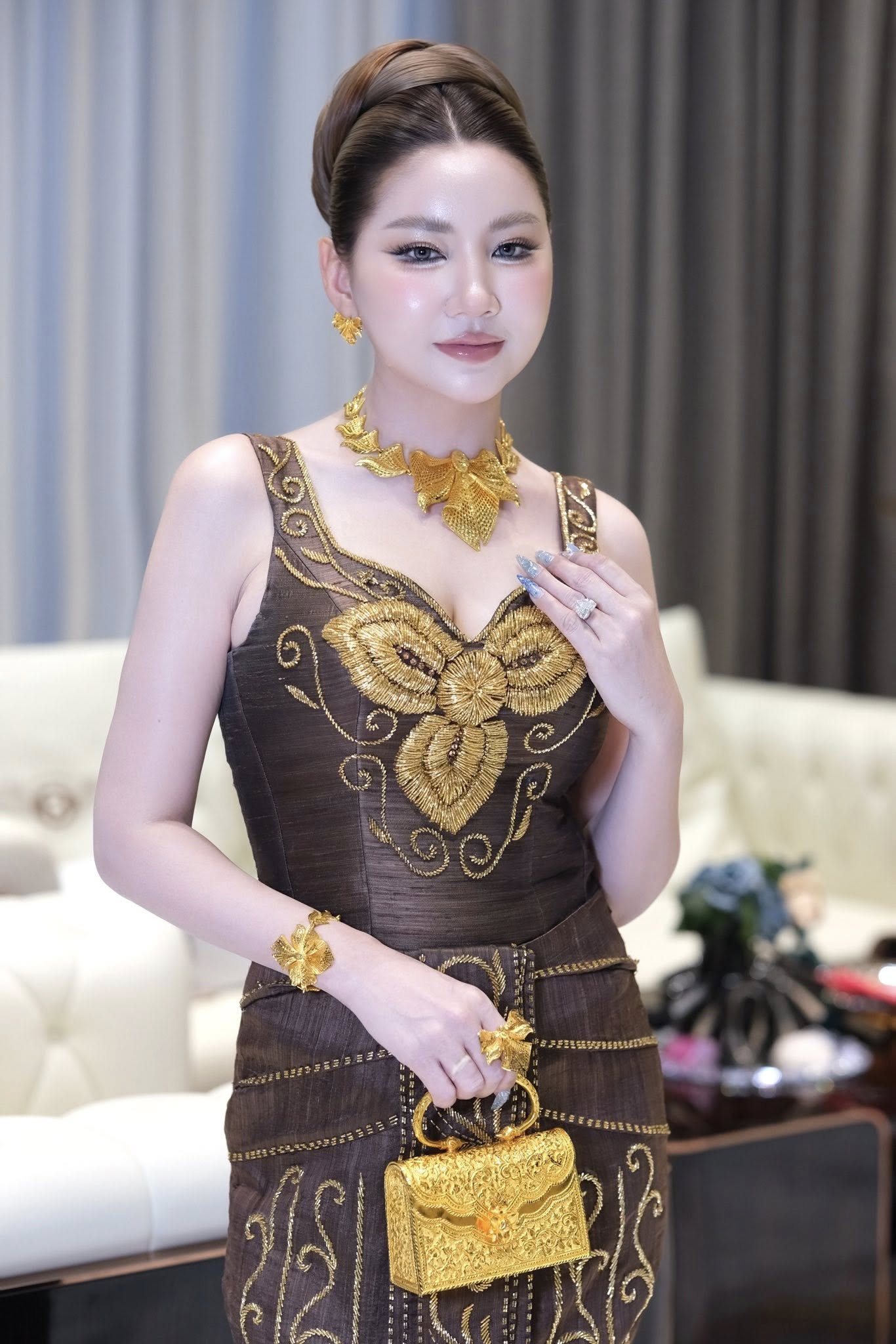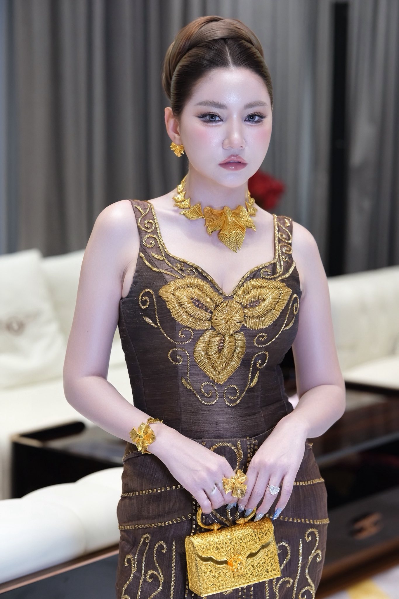 កាន់តែមិនធម្មតាគ្រឿងអលង្ការមាសសុទ្ធគ្រឿងធំៗ ពណ៌លឿងឆ្អិនឆ្អៅ និងកាបូបដៃធ្វើពីមាសរាប់សិបតម្លឹង ធ្វើឲ្យលោកស្រីមើលទៅកាន់តែអស្ចារ្យថែមមួយកម្រិតទៀត ហើយសូម្បីតែស្បែកជើងក៏ពណ៌មាសដែរ។