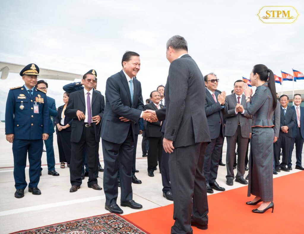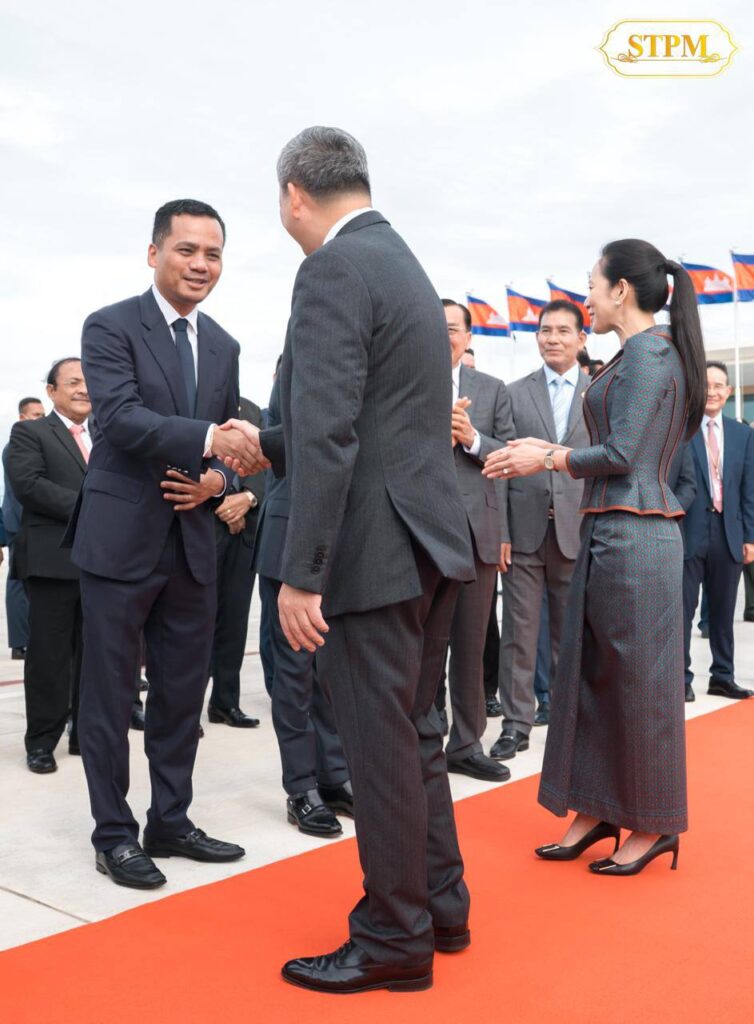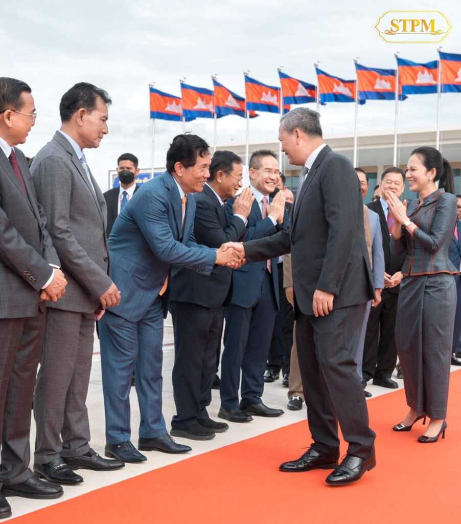 អញ្ជើញអមដំណើរ សម្តេចធិបតី និងលោកជំទាវបណ្ឌិត ពេជ ចន្ទមុន្នី ហ៊ុនម៉ាណែត រួមមាន៖ ឯកឧត្តម ប្រាក់ សុខុន ឧបនាយករដ្ឋមន្ត្រី និងជារដ្ឋមន្ត្រីការបរទេស និងសហប្រតិបត្តិការអន្តរជាតិ រួមជាមួយឧបនាយករដ្ឋមន្ត្រី ទេសរដ្ឋមន្ត្រី រដ្ឋមន្ត្រី និងមន្ត្រីជាន់ខ្ពស់រដ្ឋាភិបាល ព្រមទាំងតំណាងធុរកិច្ច មកពីសភាពាណិជ្ជកម្មកម្ពុជា និងសមាគមឧកញ៉ាកម្ពុជា។