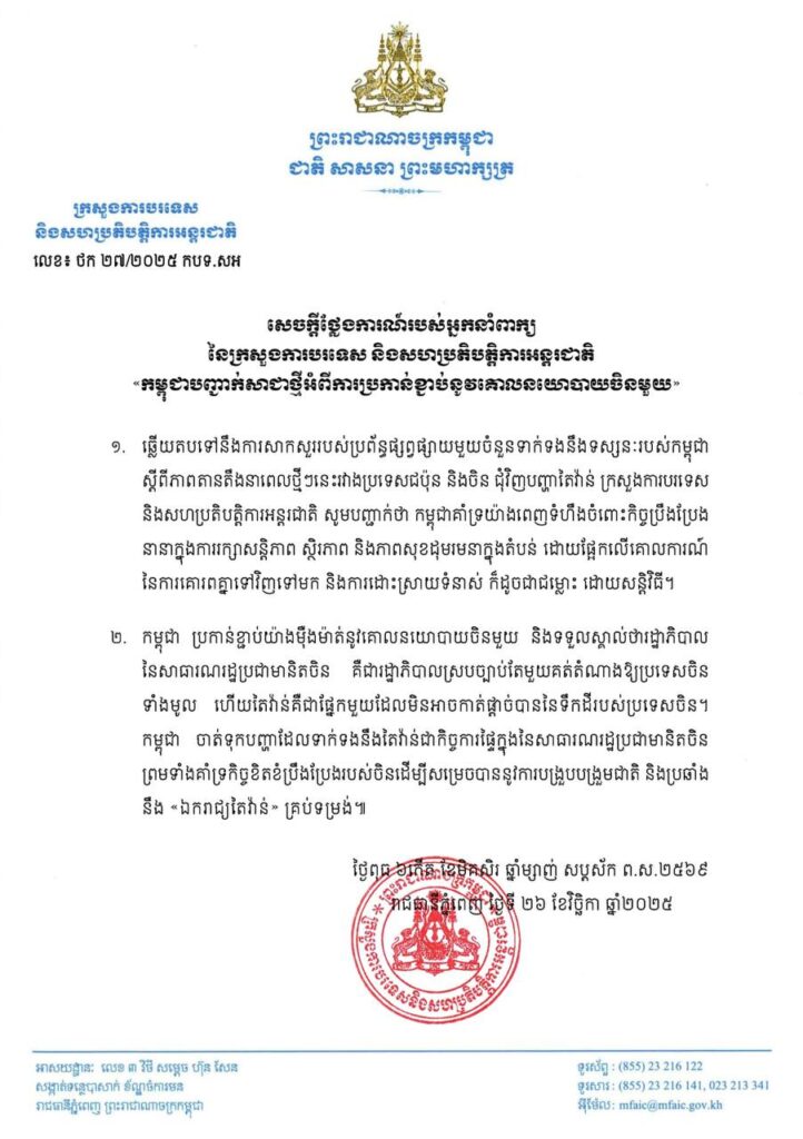 អ្នកនាំពាក្យក្រសួងការបរទេសកម្ពុជា នៅយប់ថ្ងៃទី២៦ ខែវិច្ឆិកានេះ បានចេញសេចក្តីថ្លែងការណ៍មួយ ដោយគូសបញ្ជាក់ជាថ្មីថា ប្រទេសកម្ពុជា ប្រកាន់ខ្ជាប់យ៉ាងម៉ឺងម៉ាត់នូវគោលនយោបាយចិនមួយ។