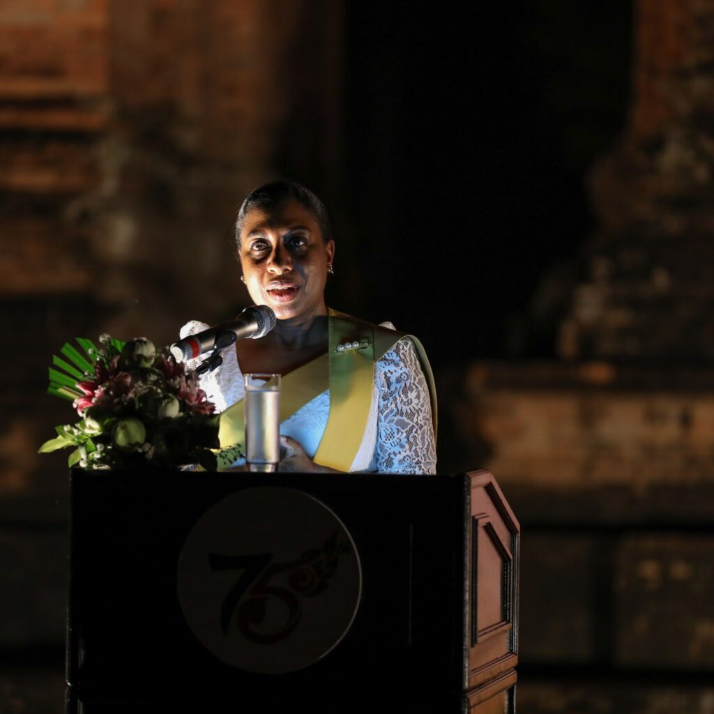 ចំណែកលោកជំទាវ ចារ្យ ភឿង សកុណា រដ្ឋមន្ត្រីក្រសួងវប្បធម៌និងវិចិត្រសិល្បៈ បានថ្លែងថា ទំនាក់ទំនងការទូតនិងមិត្តភាពរយៈពេល ៧៥ឆ្នាំមកនេះ បានធ្វើឱ្យព្រះរាជាណាចក្រកម្ពុជា និងសហរដ្ឋអាមេរិក ក្លាយជាដៃគូនៃកិច្ចសហប្រតិបត្តិការ ព្រមទាំងប្តេជ្ញាចិត្តរួមគ្នាដើម្បីសន្តិភាពនិងការអភិវឌ្ឍន៍។