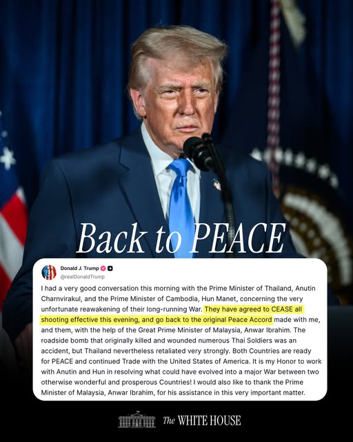 លោក ដូណាល់ ត្រាំ ប្រធានាធិបតីអាមេរិក នៅព្រឹកថ្ងៃទី ១៣ ខែធ្នូ ឆ្នាំ ២០២៥ បានបង្ហោះសារលើបណ្តាញសង្គមថា សម្តេចមធិបតី ហ៊ុន ម៉ាណែត នាយករដ្ឋមន្ត្រីកម្ពុជា និងលោក អនុទីន ចាន់វីរគុល នាយករដ្ឋមន្ត្រីចាំផ្ទះរបស់ថៃ បានព្រមព្រៀងបញ្ចប់ការបាញ់គ្នា និងវិលទៅរកការអនុវត្តសេចក្តីថ្លែងការណ៍រួមស្តីពីសន្តិភាពរវាងកម្ពុជា-ថៃ កាលពីថ្ងៃទី២៦ ខែតុលា នៅទីក្រុងកូឡាឡាំពួរ ប្រទេសម៉ាឡេស៊ីឡើងវិញ។