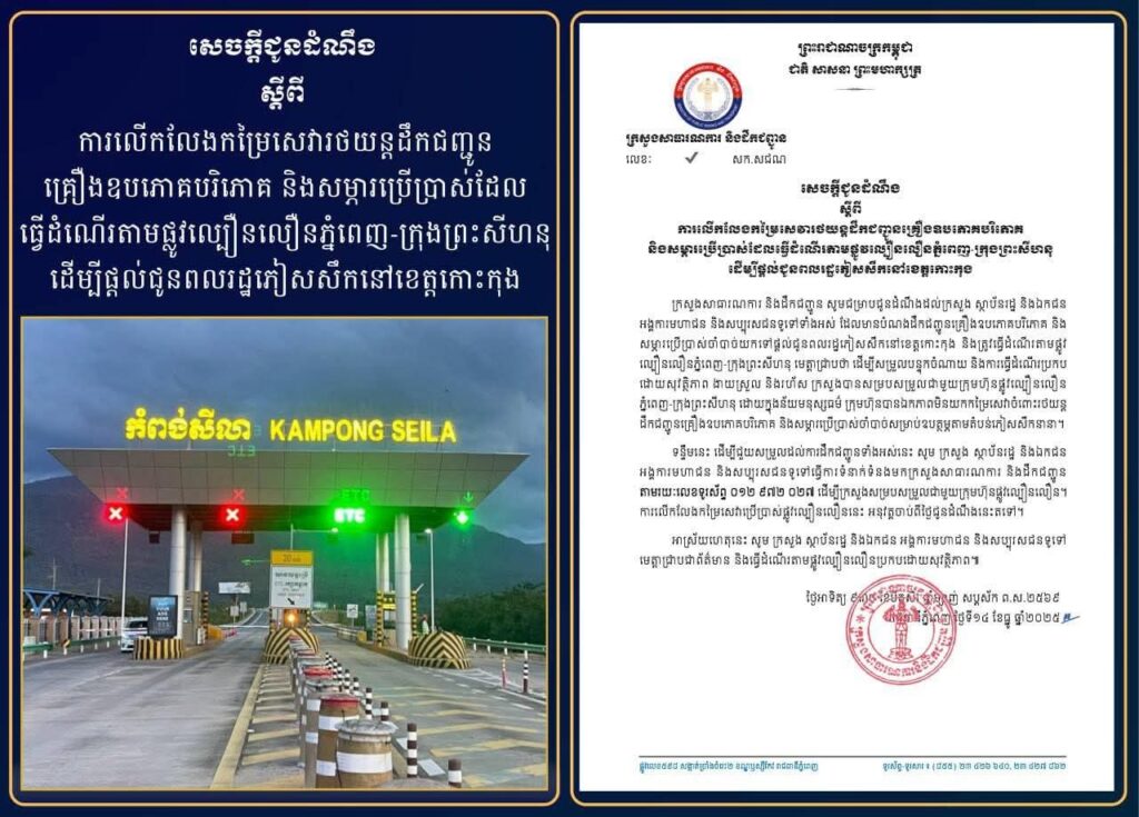 ក្នុងលិខិតរបស់ក្រសួងសាធារណការ និងដឹកជញ្ជូនកម្ពុជា បានបញ្ជាក់ឲ្យដឹងយ៉ាងច្បាស់ មិនថាក្រសួង ស្ថាប័ន និងឯកជនអង្គការមហាជន និងសប្បុរសជនទូទៅ ដែលមានបំណងដឹកជញ្ជូនគ្រឿងឧបភោគបរិភោគ និងសម្ភារប្រើប្រាស់ចាំបាច់យកទៅផ្ដល់ជូនពលរដ្ឋភៀសសឹក នៅខេត្តកោះកុង ហើយធ្វើដំណើរតាមផ្លូវល្បឿនលឿន មិនមានការបង់កម្រៃសេវាឡើយ។