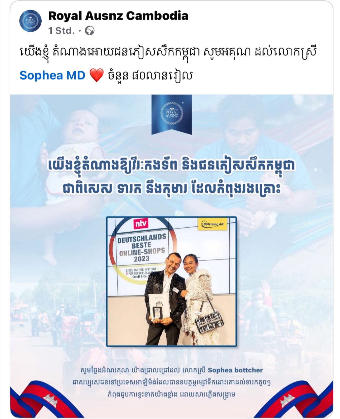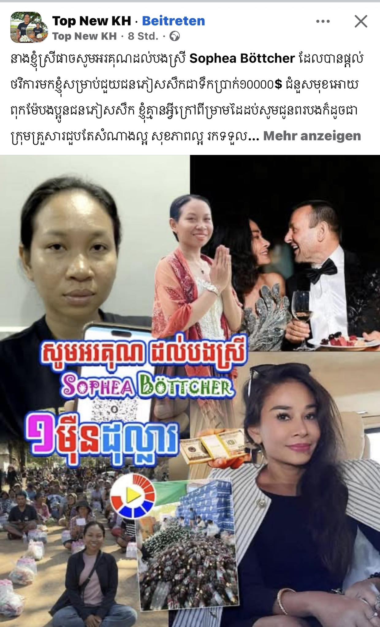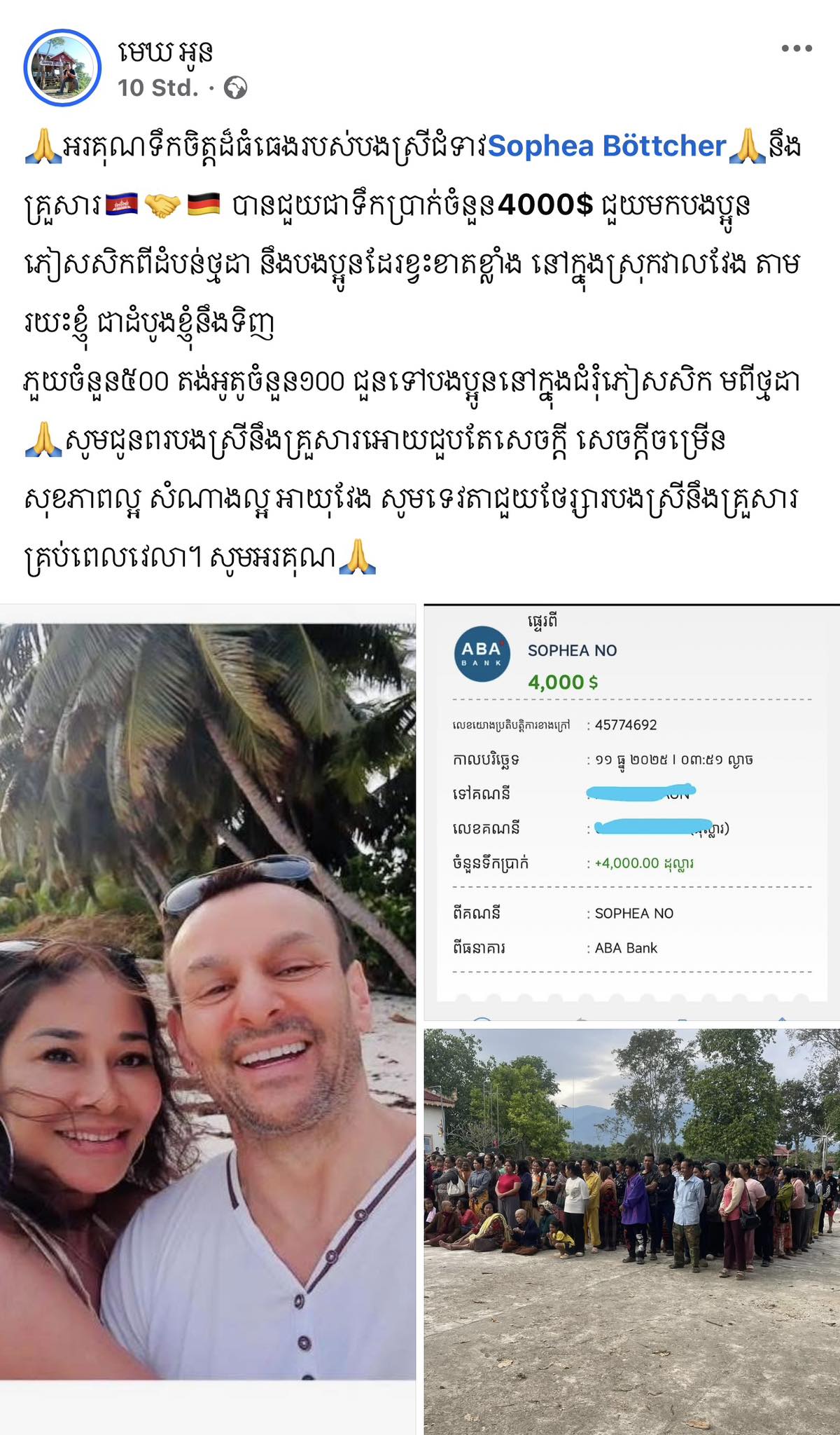 ភរិយាស្ថាបនិកនៃក្រុមហ៊ុន Bottcher AG មិនបានឈរឱបដៃមើលជនភៀសសឹកដែលជាខ្មែរដូចគ្នារស់នៅដោយភាពលំបាកឡើយ ដោយលោកស្រីបាន បរិច្ចាគទៅតាមបុគ្គលមានឥទ្ធិពលជាច្រើនរូបក្នុងប្រទេសកម្ពុជា និងក្រុមហ៊ុនផ្សេងៗ។ មិនតែប៉ុណ្ណោះលោកស្រី ដែលមានទីកន្លែងកំណើតនៅខេត្តកំពង់ធំ បានជួយថវិកាផ្ទាល់ដោយកងទ័ព និងជនភៀសសឹកតាមរយៈ QR កូដផ្ទាល់ៗ និងតាមសំណាក់អាជ្ញាធរតាមតំបន់ផ្ទាល់ទៀតផង៖