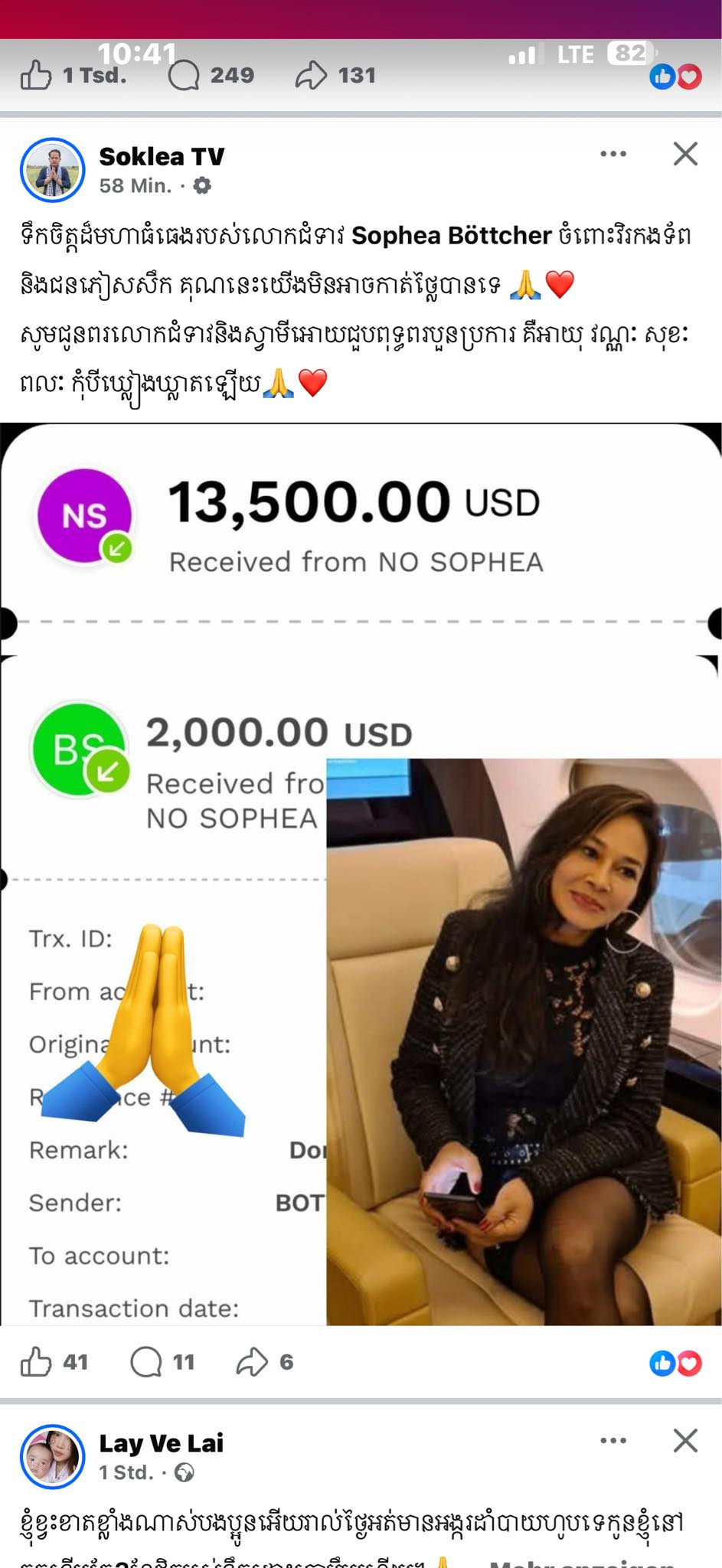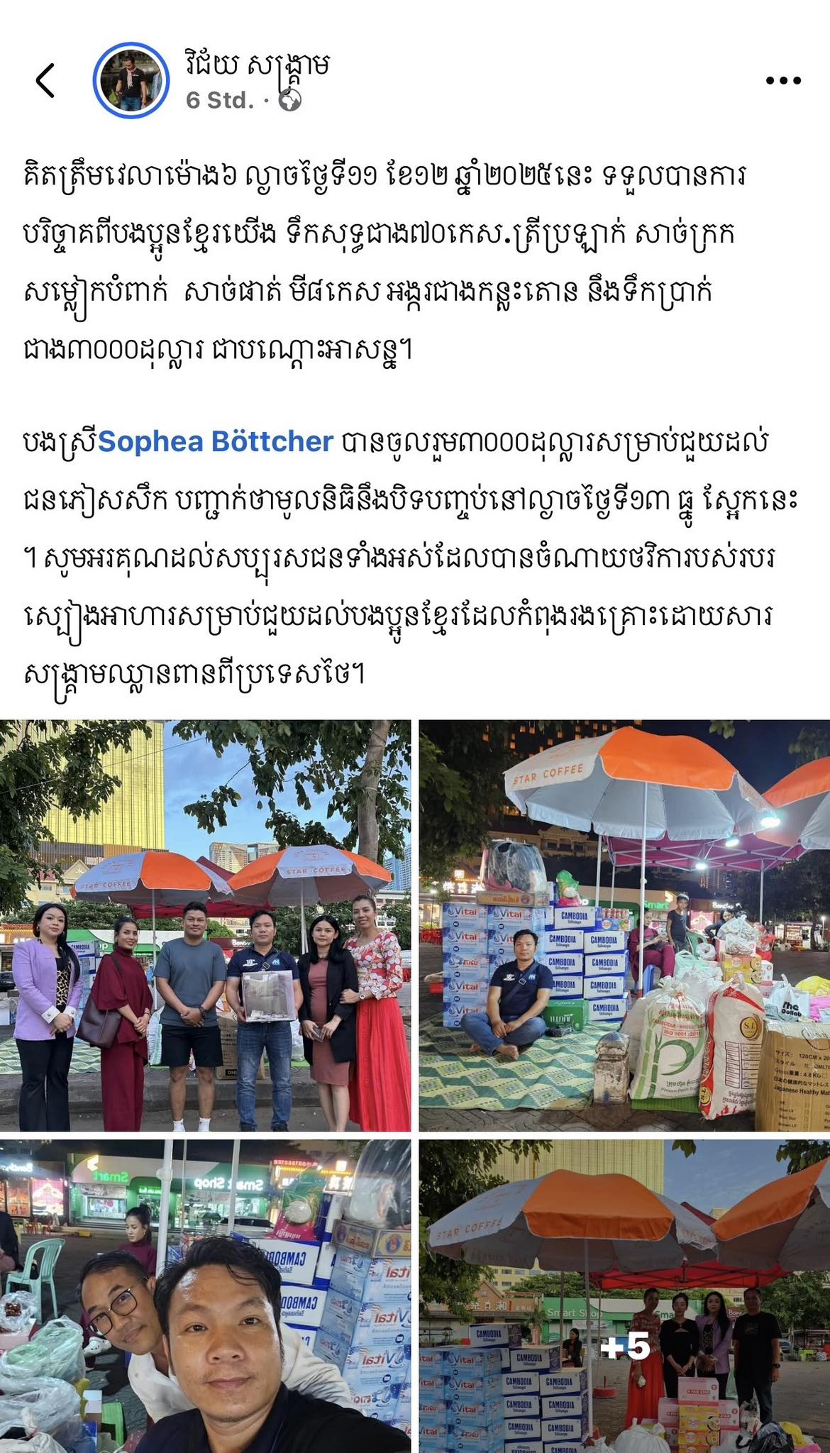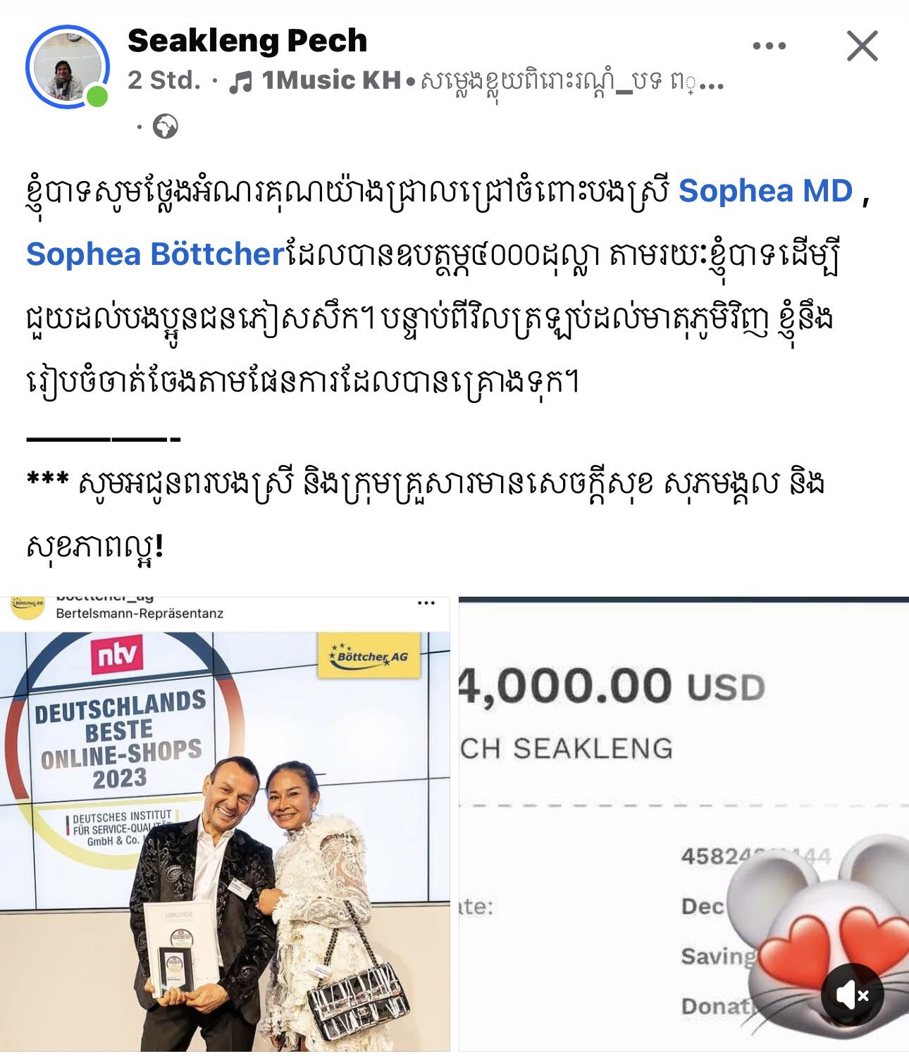ភរិយាស្ថាបនិកនៃក្រុមហ៊ុន Bottcher AG មិនបានឈរឱបដៃមើលជនភៀសសឹកដែលជាខ្មែរដូចគ្នារស់នៅដោយភាពលំបាកឡើយ ដោយលោកស្រីបាន បរិច្ចាគទៅតាមបុគ្គលមានឥទ្ធិពលជាច្រើនរូបក្នុងប្រទេសកម្ពុជា និងក្រុមហ៊ុនផ្សេងៗ។ មិនតែប៉ុណ្ណោះលោកស្រី ដែលមានទីកន្លែងកំណើតនៅខេត្តកំពង់ធំ បានជួយថវិកាផ្ទាល់ដោយកងទ័ព និងជនភៀសសឹកតាមរយៈ QR កូដផ្ទាល់ៗ និងតាមសំណាក់អាជ្ញាធរតាមតំបន់ផ្ទាល់ទៀតផង៖