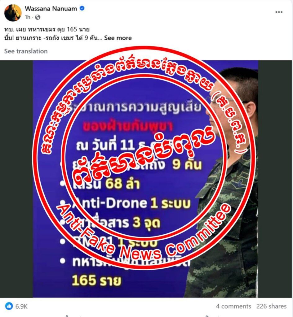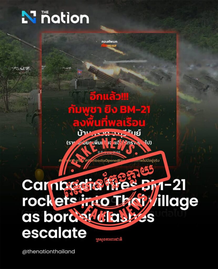 ថៃ បានបន្តបង្កើតព័ត៌មានក្លែងក្លាយជាច្រើន ក្នុងនោះថៃក៏បានប្រើបច្ចេកវិទ្យា AI ដើម្បីប្រឌិត កាឡៃការពិតជុំវិញស្ថានភាពជម្លោះបច្ចុប្បន្ន និងថ្មីៗនេះ បានបង្កើតរូបភាពអវិជ្ជមានប៉ះពាល់ធ្ងន់ធ្ងរ ដល់អង្គព្រះមហាក្សត្រ ថ្នាក់ដឹកនាំជាតិ រាជរដ្ឋាភិបាល កងទ័ព និងពលរដ្ឋកម្ពុជា។ នេះបើតាមការឱ្យដឹងពីឯកឧត្តម ទេព អស្នារិទ្ធ អនុរដ្ឋលេខាធិការ និងអ្នកនាំពាក្យក្រសួងព័ត៌មាន នៅថ្ងៃទី២៣ ខែធ្នូនេះ។