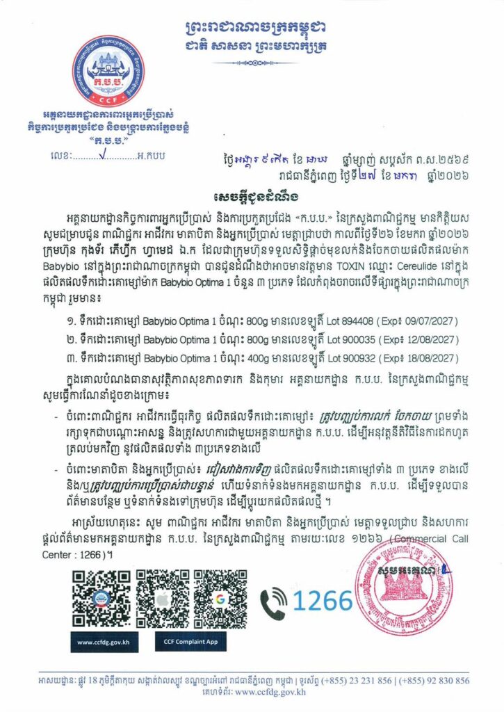 សេចក្ដីជូនដំណឹងរបស់ ក.ប.ប. នៅថ្ងៃទី២៧ ខែមករានេះ បានជម្រាបជូនដល់ពាណិជ្ជករ អាជីវករ មាតាបិតា និងអ្នកប្រើប្រាស់ថា កាលពីថ្ងៃទី២៦ ខែមករា ឆ្នាំ២០២៦ ក្រុមហ៊ុន កុងទ័រ ភើហ្វឹក ហ្វាមេដ ឯ.ក ដែលជាក្រុមហ៊ុនទទួលសិទ្ធិផ្តាច់មុខលក់ និងចែកចាយផលិតផលម៉ាក Babybio នៅកម្ពុជា បានជូនដំណឹងថា អាចមានវត្តមាន TOXIN ឈ្មោះ Cereulide នៅក្នុងផលិតផលទឹកដោះគោម្សៅម៉ាក Babybio Optima 1 ចំនួន ៣ប្រភេទ ដែលកំពុងចរាចរលើទីផ្សារកម្ពុជា។