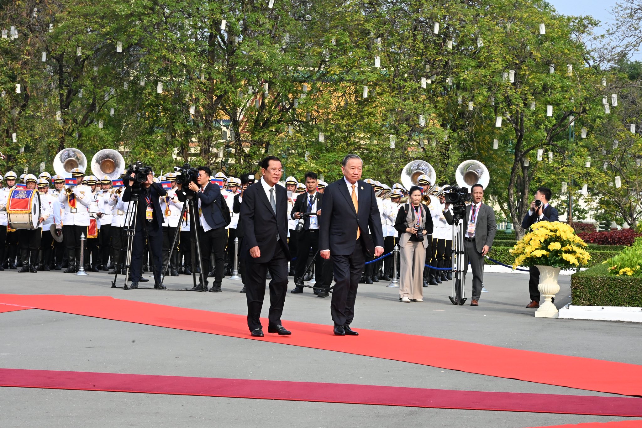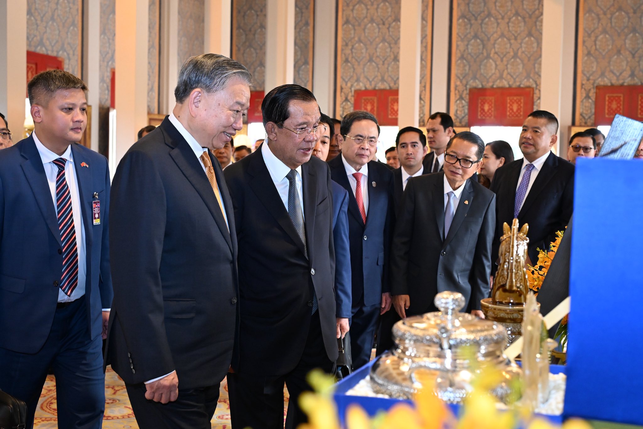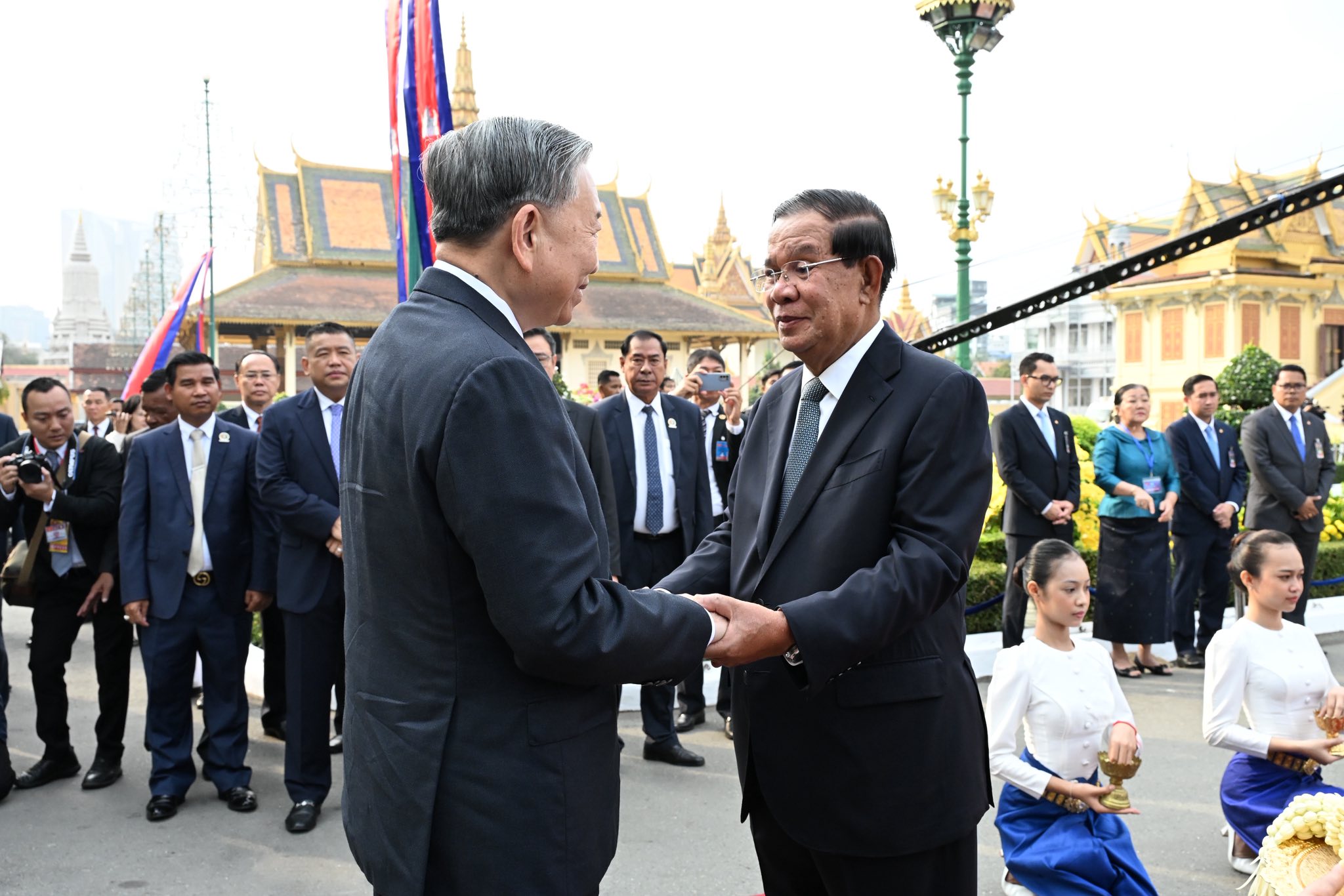 យោងតាមមាត្រា១១ថ្មី នៃ​ច្បាប់​រដ្ឋធម្មនុញ្ញ នៃ​ព្រះ​រាជាណាចក្រ​កម្ពុជា ព្រះអង្គ​សព្វ​ព្រះ​រាជហឫទ័យ ប្រោស​ព្រះរាជ​ទាន សម្ដេច​អគ្គ​មហា​សេនាបតី​តេជោ ហ៊ុន សែន ប្រធាន​ព្រឹទ្ធសភា នៃ​ព្រះ​រាជាណាចក្រ​កម្ពុជា និង​ជា​ប្រធាន​ក្រុម​ឧត្ដម​ប្រឹក្សា​ផ្ទាល់ ព្រះមហាក្សត្រ ជួយ​ទទួល​ក្នុង​ព្រះ​បរម​នាម​ជា​ប្រមុខ​រដ្ឋ នៃ​ព្រះរាជាណាចក្រកម្ពុជា ស្វាគមន៍ឯកឧត្តម តូ ឡឹម អគ្គលេខាធិការ នៃ​គណៈកម្មាធិការ​មជ្ឈិម គណបក្ស​កុម្មុយនីស្ត​វៀតណាម និង​គណៈប្រតិភូជាន់ខ្ពស់ ក្នុង​ឱកាស​អញ្ជើញ​មក​បំពេញ​ទស្សនកិច្ច​ផ្លូវ​រដ្ឋ នៅព្រះរាជាណាចក្រកម្ពុជា និងនៅក្នុងព្រះបរមរាជវាំង នៅថ្ងៃទី៦ ខែកុម្ភៈ ឆ្នាំ២០២៦។