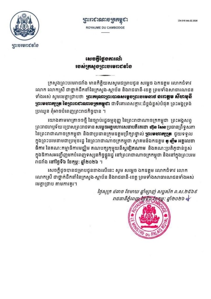 នៅ​ព្រឹក​ថ្ងៃ​៦ ខែ​កុម្ភៈ ឆ្នាំ ២០២៦ នេះ ក្រសួង​ព្រះ​បរម​រាជ​វាំង បាន​ចេញ​សេចក្ដី​ថ្លែងការណ៍​បញ្ជាក់​ថា ព្រះ​មហាក្សត្រ​កម្ពុជា ព្រះករុណា​ព្រះបាទ​សម្ដេច​ព្រះ​បរមនាថ នរោត្តម សីហមុនី ព្រះ​អង្គ​ទ្រង់​ប្រឈួន ពុំ​អាច​បំពេញ​ព្រះ​រាជកិច្ច​បាន ប្រគល់ភារកិច្ចជូនសម្តេចតេជោ ហ៊ុន សែន ជា​ប្រមុខរដ្ឋ​ឲ្យ​ទទួល​ស្វាគមន៍​លោក តូ ឡឹម អគ្គលេខាធិការគណបក្សកុម្មុយនីស្តវៀតណាម នៅ​ក្នុង​ព្រះ​បរមរាជវាំង។
