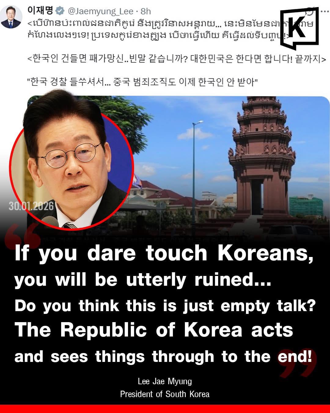 រំលឹកថាកាលពីថ្ងៃ ៣០ ខែមករា ឆ្នាំ ២០២៦ កន្លងទៅ លោកប្រធានាធិបតិកូរ៉េបានបង្ហោះសារមួយនៅលើបណ្ដាញសង្គម ដោយមានអក្សរខ្មែរមានខ្លឹមសារថា នឹងកម្ទេចអ្នកប៉ះពាល់ជនជាតិកូរ៉េ មិនឱ្យរួចខ្លួនឡើយ។