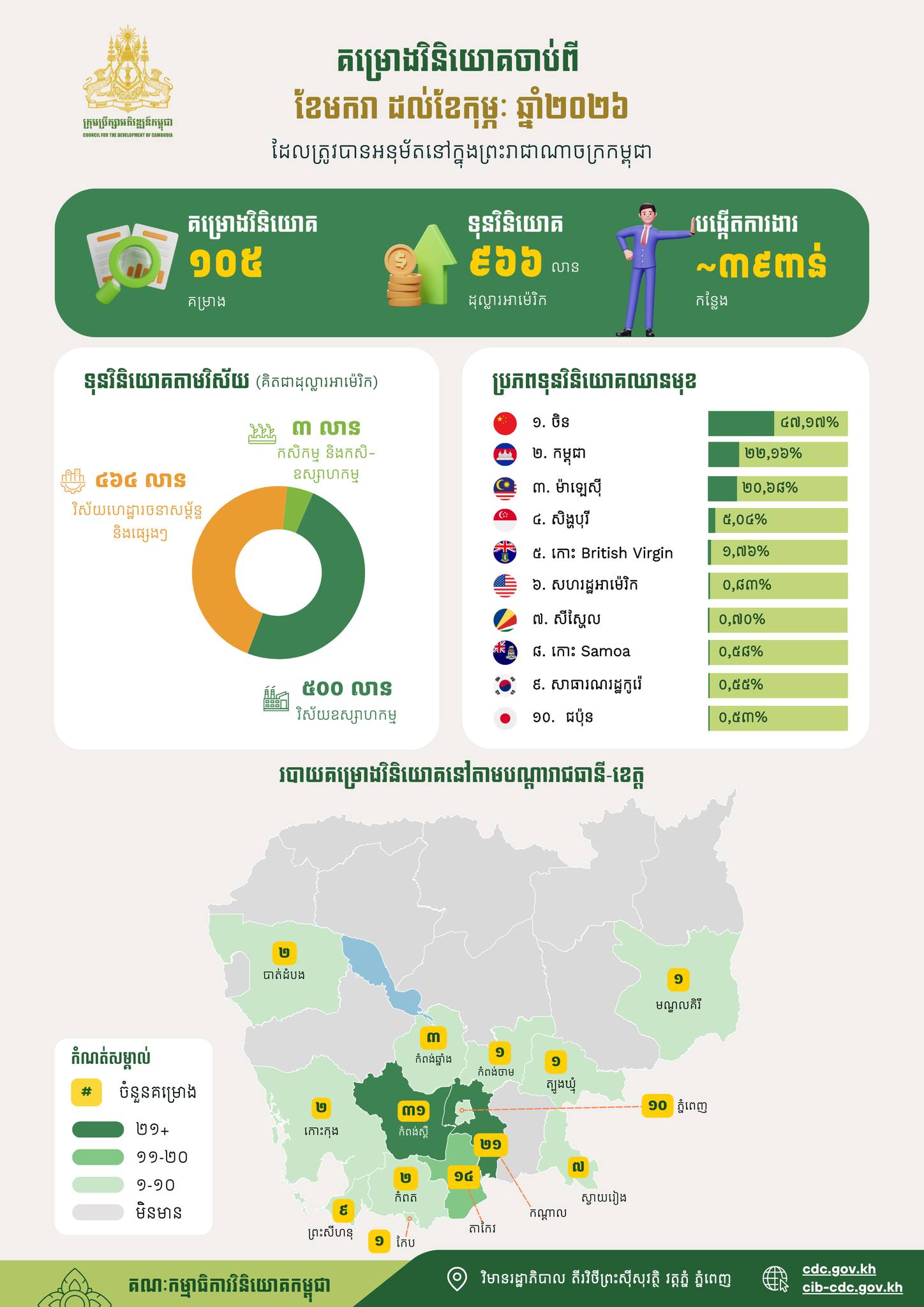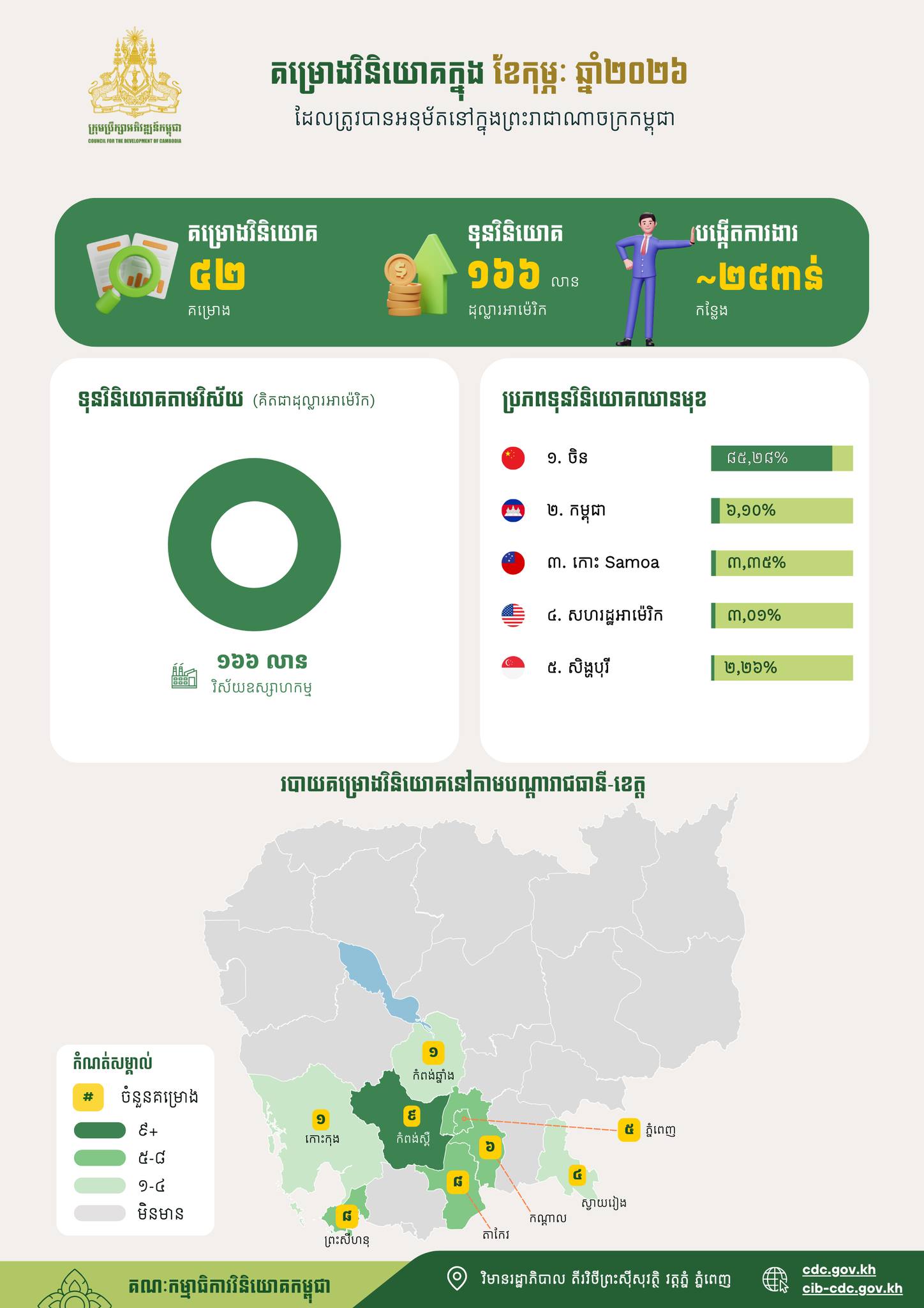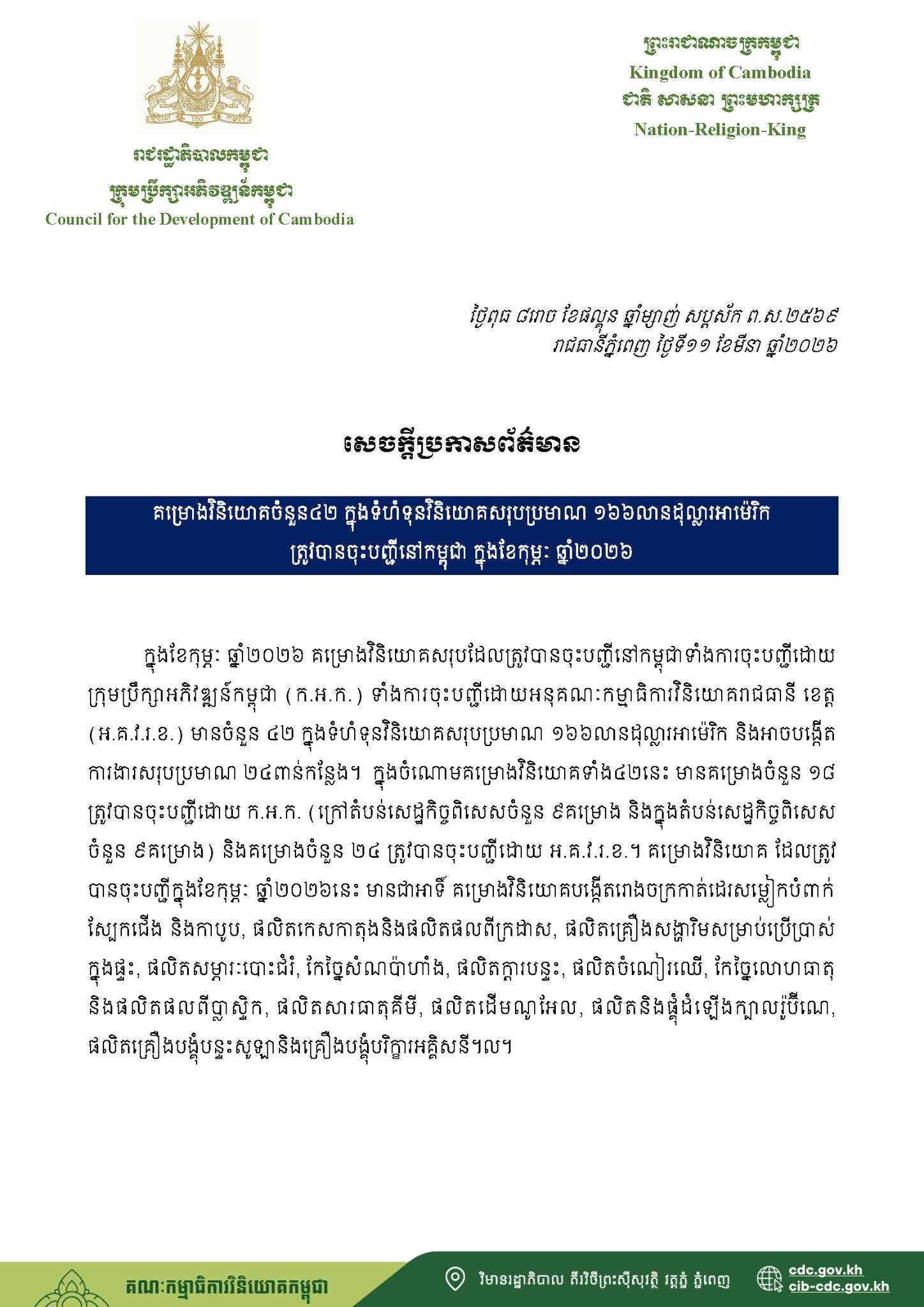 គម្រោង​វិនិយោគ ៤២ ក្នុង​ទំហំ​ទុន​វិនិយោគ​សរុប​ប្រមាណ ១៦៦ លាន​ដុល្លារ ត្រូវ​បាន​ចុះ​បញ្ជី​នៅ​កម្ពុជា កាលពី​ខែ​កុម្ភៈ ឆ្នាំ ២០២៦ គម្រោង​វិនិយោគ​សរុប​ដែល​ត្រូវ​បាន​ចុះ​បញ្ជី​នៅ​កម្ពុជា​ទាំង​ការ​ចុះ​បញ្ជី​ដោយ​ក្រុមប្រឹក្សា​អភិវឌ្ឍន៍​កម្ពុជា ទាំង​ការ​ចុះ​បញ្ជី​ដោយ​អនុ​គណៈកម្មាធិការ​វិនិយោគ​រាជធានី ខេត្ត និង​អាច​បង្កើត ការងារ​សរុប​ប្រមាណ ២៤ ពាន់​កន្លែង។