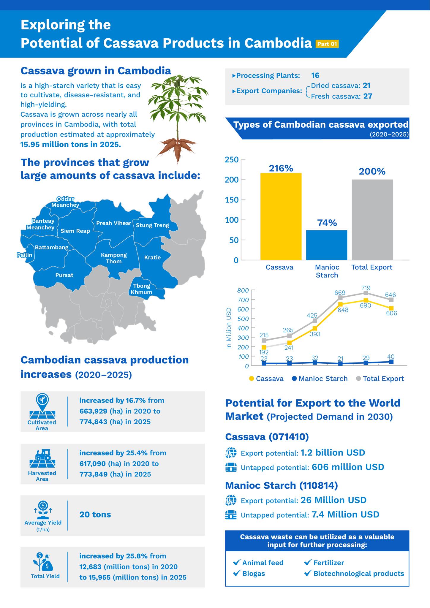 បច្ចុប្បន្ននៅកម្ពុជាមានរោងចក្រកែច្នៃដំឡូងមី ១៦ និងក្រុមហ៊ុននាំចេញទៅទីផ្សារអន្តរជាតិលើសពី ២០ ក្រុមហ៊ុន។ គិតចន្លោះពីឆ្នាំ ២០២០ ដល់ ២០២៥ គឺការនាំចេញដំឡូងមីកម្ពុជាទៅទីផ្សារអន្តរជាតិបានកើនឡើងប្រហែល ២០០% ដោយក្នុងនោះការនាំចេញដំឡូងមីស្រស់/ស្ងួត កើន ២១៦% ចំណែកម្សៅដំឡូងមី កើន ៧៤%។