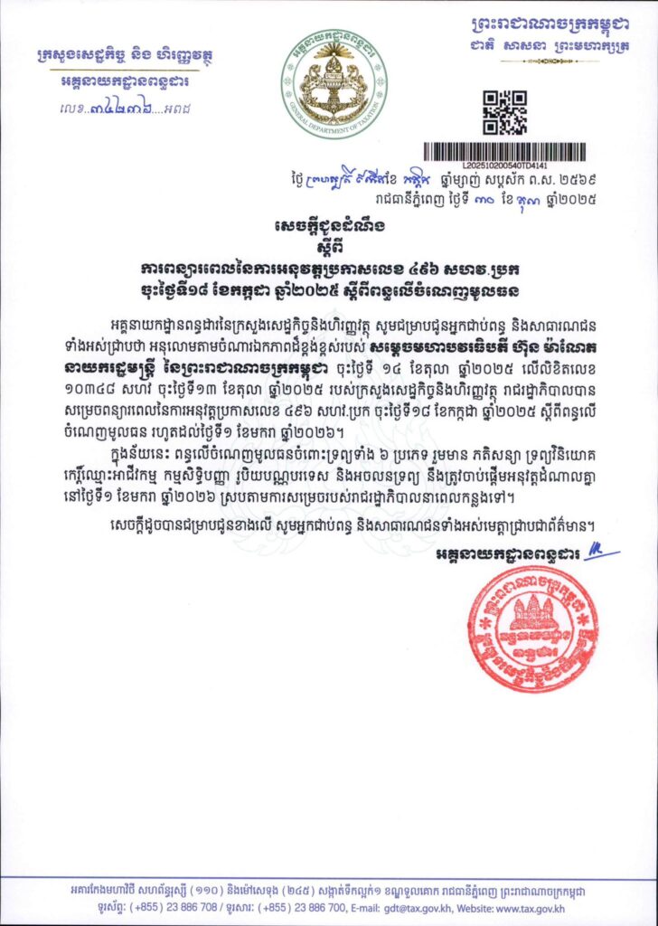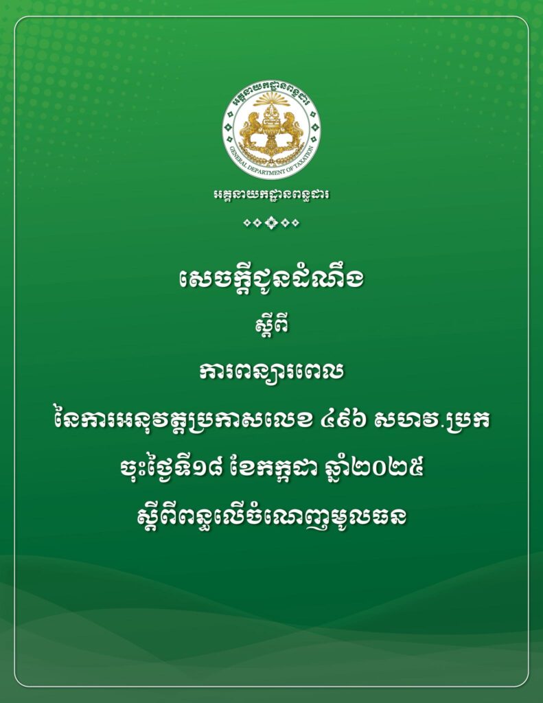 នេះបើយោងតាមសេចក្តីជូនដំណឹងស្តីពី ការពន្យារពេលនៃការអនុវត្តប្រកាសលេខ ៤៩៦ សហវ.ប្រក ចុះថ្ងៃទី១៨ ខែកក្កដា ឆ្នាំ២០២៥ ស្តីពីពន្ធលើចំណេញមូលធន ពីអគ្គនាយកដ្ឋានពន្ធដារ ដែលបានចេញផ្សាយកាលពីថ្ងៃទី ៣០ ខែតុលា ឆ្នាំ ២០២៥។