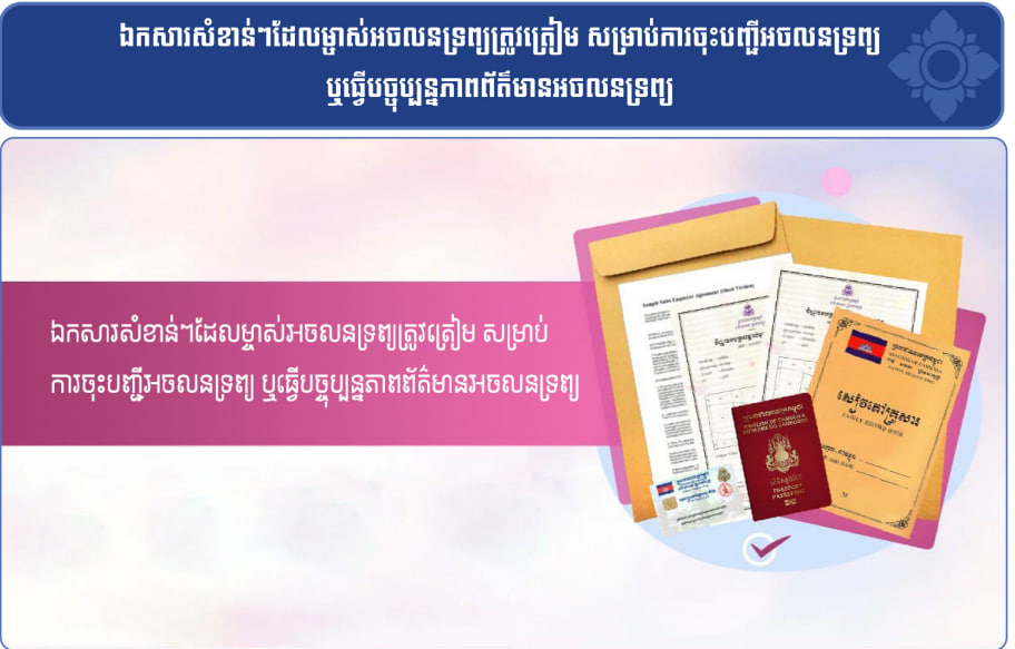 ដើម្បីចុះបញ្ជី បង់ពន្ធលើអចលនទ្រព្យ អ្នកជាប់ពន្ធដែលជាម្ចាស់អចលនទ្រព្យត្រូវរៀបចំឯកសារសំខាន់ៗមួយចំនួនដូចជា៖